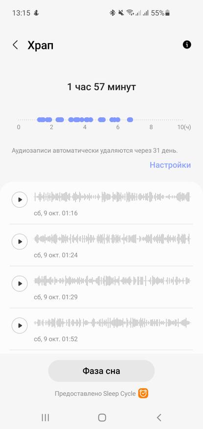В часах все это расписано более сжато, а в смартфоне можно посмотреть уже в деталях, где фиксируется точное время храпа и делается его аудиозапись.